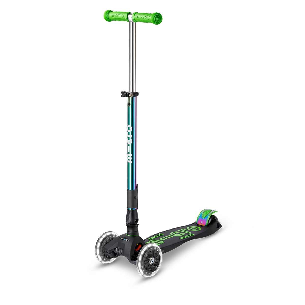 Der Maxi Micro Deluxe Foldable LED in edlem Neochrome Green ist ein echter Hingucker auf jeder Fahrt. Mit seinem schimmernden Farbwechsel-Look, leuchtenden LED-Rollen und praktischem Klappmechanismus bietet er Stil, Komfort und Sicherheit in einem.